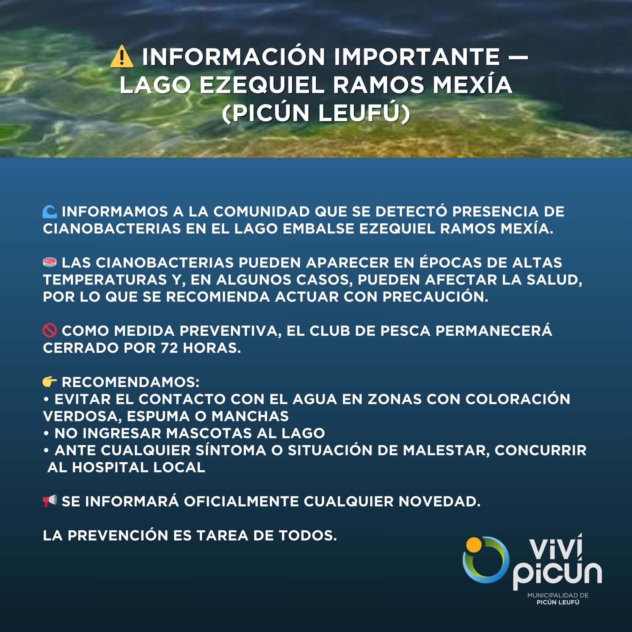 Autoridades municipales de Picún Leufú informaron la detección de cianobacterias en el lago embalse Ezequiel Ramos Mexía, un fenómeno ambiental que suele aparecer en épocas de temperaturas elevadas y que puede generar efectos adversos en la salud.