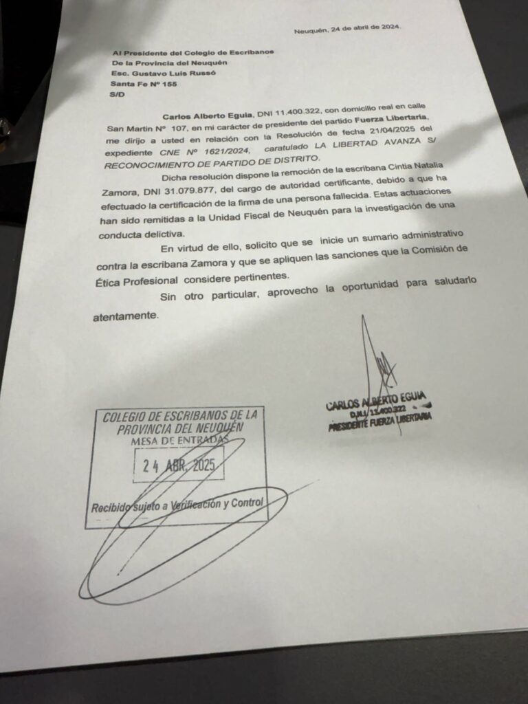 El presidente de Fuerza Libertaria, Carlos Eguía, presentó una denuncia formal contra la escribana Cintia Zamora, actual directora del PAMI en San Martín de los Andes. La acusación se centra en su rol como certificadora de documentos presuntamente vinculAdos a una persona fallecida. El caso ya fue elevado al Colegio de Escribanos.