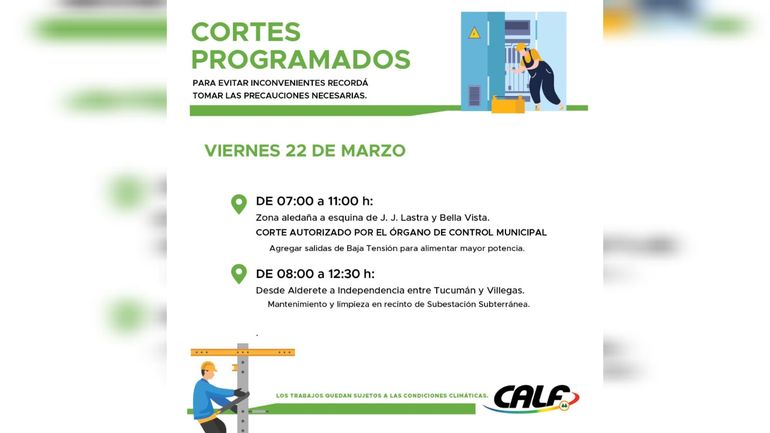 En tanto, CALF agregó que desde las 8 a las 12.30 se interrumpirá el servicio de energía eléctrica para hacer mantenimiento y limpieza en una subestación subterránea ubicada en la calle Alderete e Independencia, entre Tucumán y Villegas.