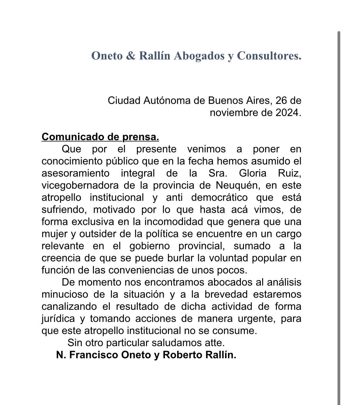 En medio de las crecientes tensiones políticas en Neuquén, los abogados de la vicegobernadora Gloria Ruiz, N. Francisco Oneto y Roberto Rallín, emitieron un contundente comunicado denunciando lo que describen como un «atropello institucional y antidemocrático» en su contra.