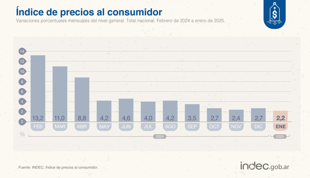 “La variación del Índice de Precios al Consumidor (IPC) registrada en enero de 2025 fue del 2,2%, la más baja desde el inicio de la administración del Presidente Javier Milei y la menor desde julio de 2020. Desde el comienzo de esta gestión, la Argentina comenzó a transitar un proceso de estabilización y desinflación basado en tres anclas: fiscal, monetaria y cambiaria”, sostuvo el titular del Palacio de Hacienda.