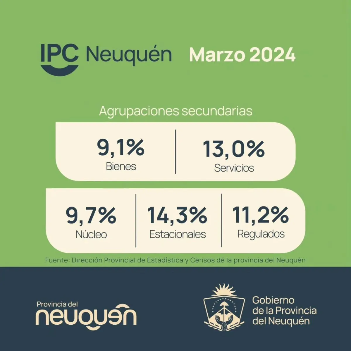 La Dirección Provincial de Estadística y Censos de la Provincia del Neuquén informó el Índice de Precios al Consumidor para el mes de marzo de 2024.