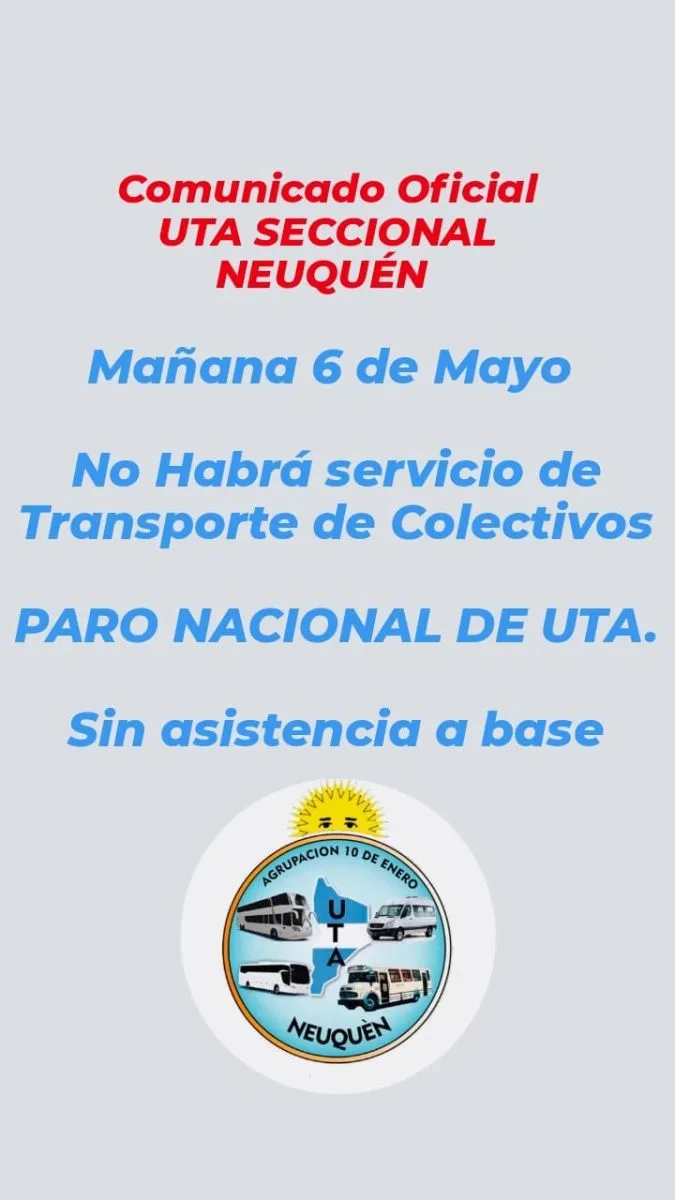La jornada del martes será complicada para miles de trabajadores y estudiantes de Neuquén y Río Negro. La Unión Tranviarios Automotor (UTA) convocó a un paro nacional que comenzará a las 00 del martes 6 de mayo, y las seccionales regionales confirmaron su adhesión.