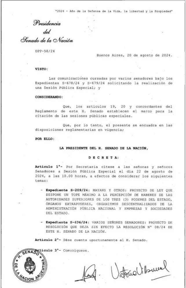 La presidente del Senado, Victoria Villarruel, convocó a una sesión especial el jueves a las 10 para que los senadores debatan sobre el aumento de sus sueldos.